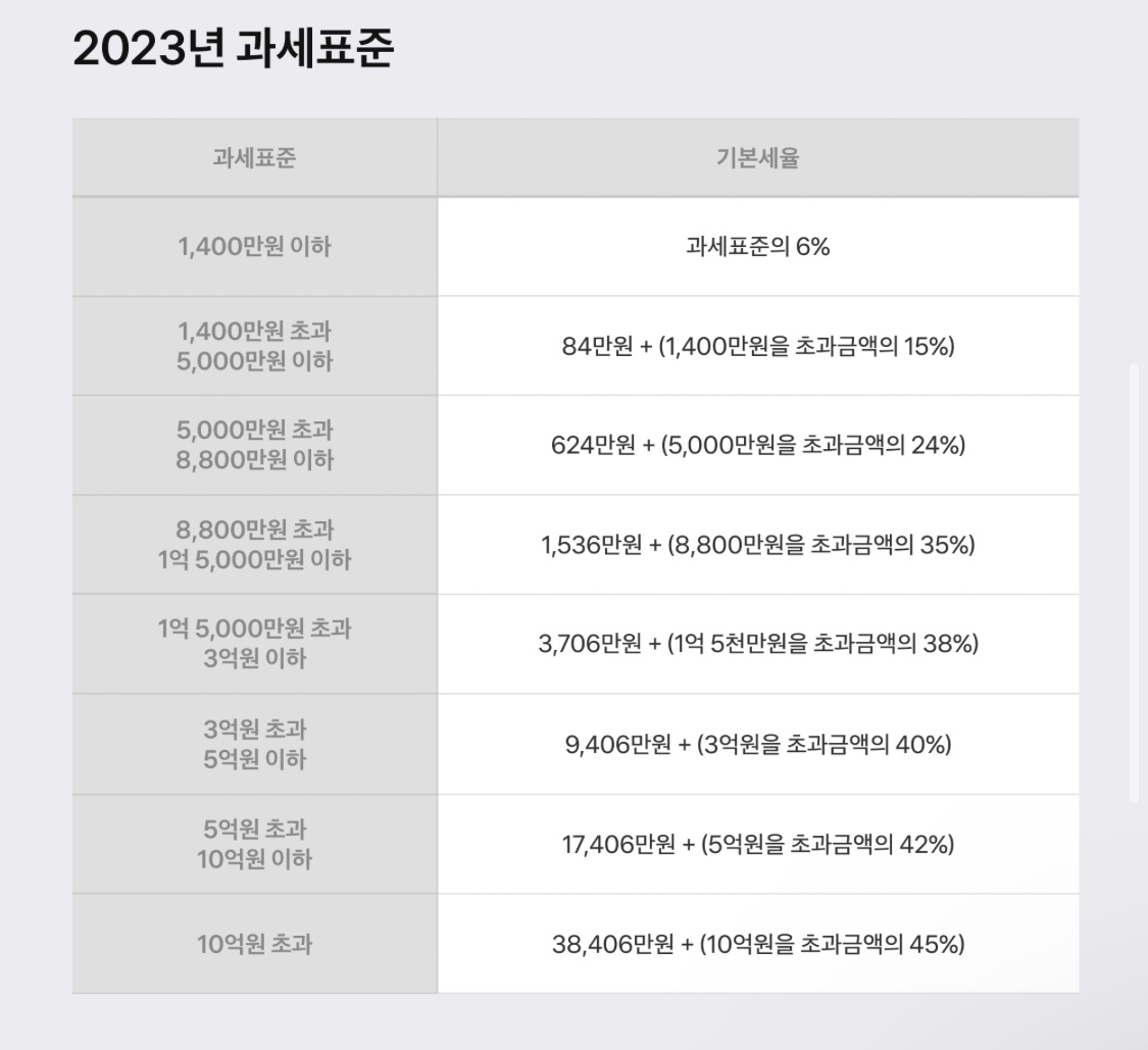 2023년도 기준 과세표준 표는 참고로 아래와 같다.