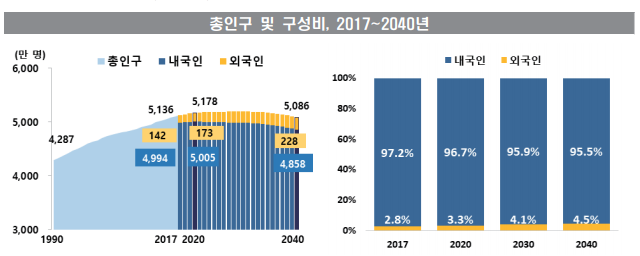 외국인의 인구 구성비는 매해 늘어나고 있고 2040년에는 4.5%가 될 것으로 통계청은 추계하고 있습니다.
