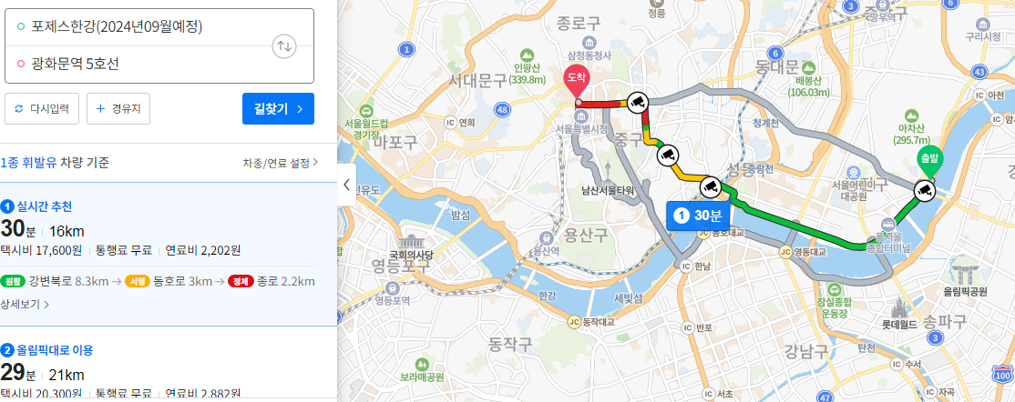 광화문/종로 지역까지는 대중교통으로 약 40분 정도 소요된다.