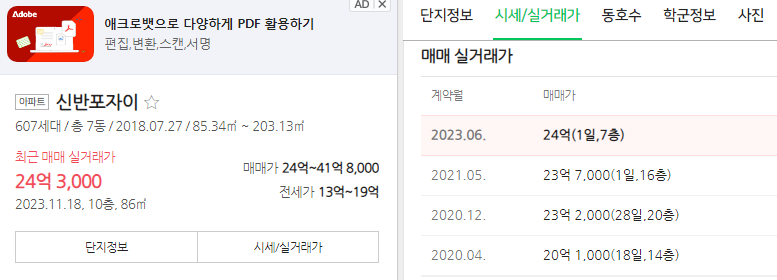 우선 가장 가까운 신반포자이는 마지막 거래가 24억이네요.
