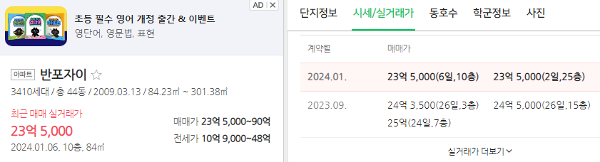 반대편 반포자이는 24평 최근 거래가 23.5억원입니다. 마찬가지로 괜찮은 분양가라고 보이네요.