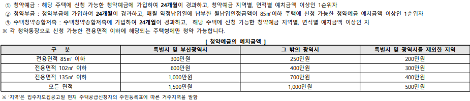 우선 공통적으로 기본이겠지만 주택청약 통장을 가입한 지 24개월이 지나야 하고 (다자녀, 신혼부부 특공은 6개월 이상), 서울시 85제곱미터 이하니까 주택청약 통장에 300만원 이상 불입했어야 합니다.