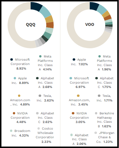 QQQ는 브로드컴, 코스트코가 포함되어 있고 VOO는 버크셔해서웨이와 JP모건체이스와 같은 금융주가 포함되어 있다.