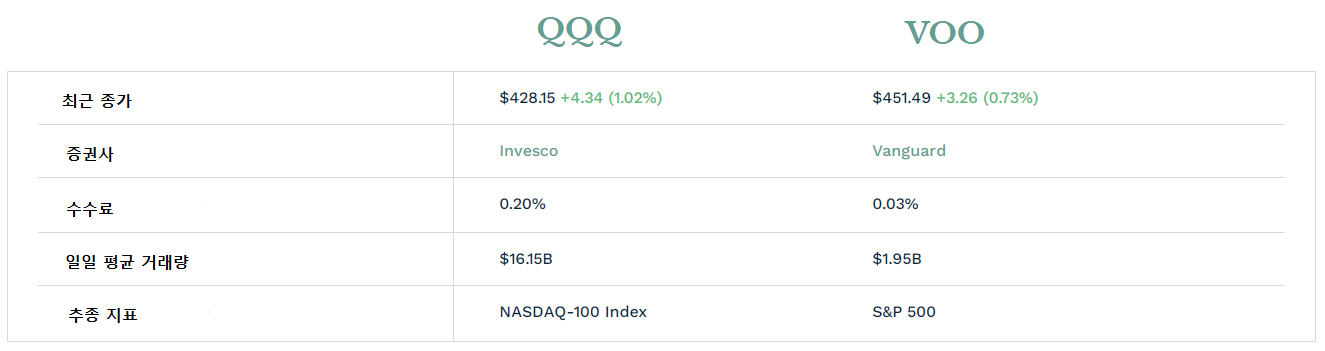 추종하는 지표의 경우 QQQ는 NASDAQ 100을 추종하고 VOO는 S&P (Standard & Poors) 500 지수를 추종한다.