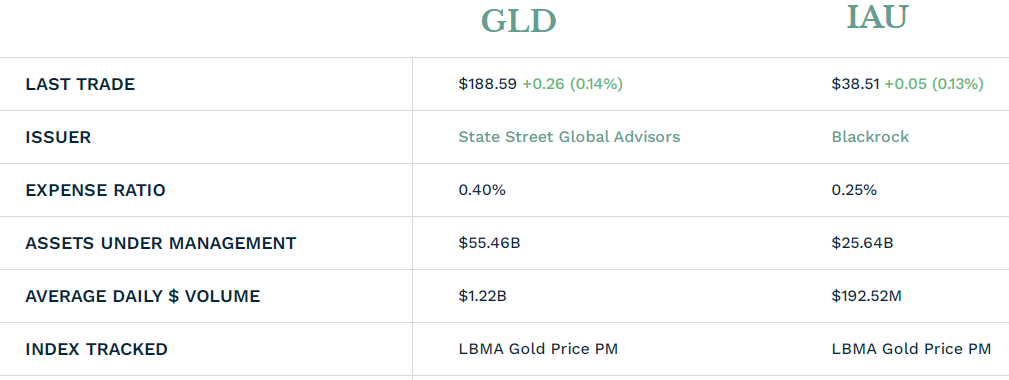 마지막 거래 (2024년 1월 30일) 기준으로는 GLD는 주당 $188.59, IAU는 주당 $38.51이다.