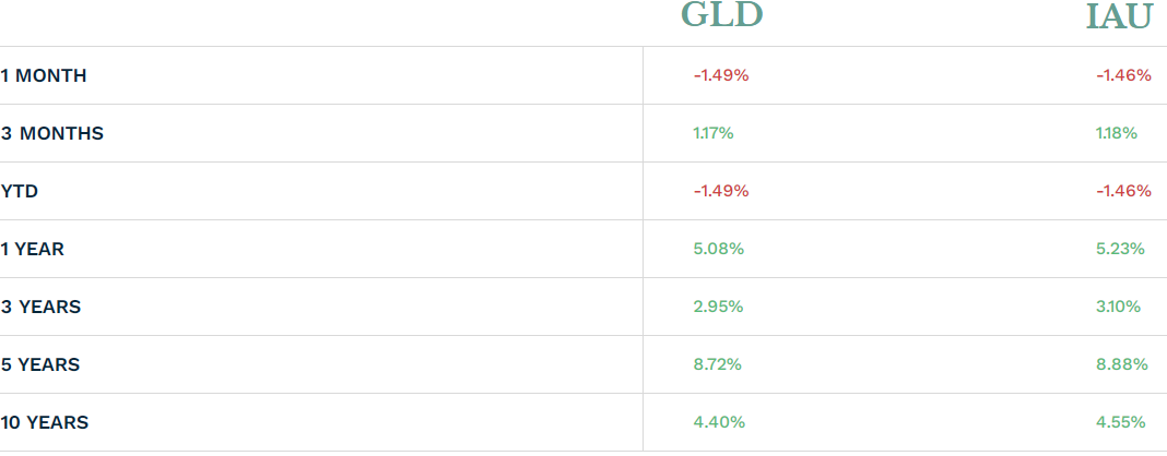 IAU가 조금 더 1년 기준 수익률이 높다 (GLD: 5.08% / IAU: 5.23%).