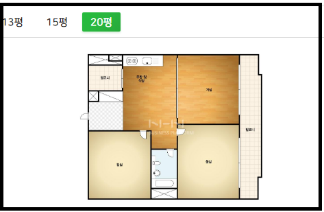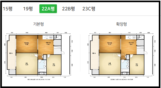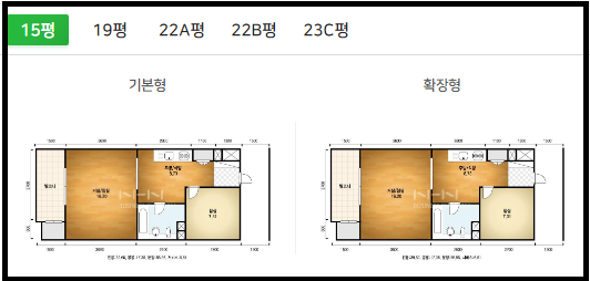 15평은 13평과 구조는 같은데 평수가 더 넓다.