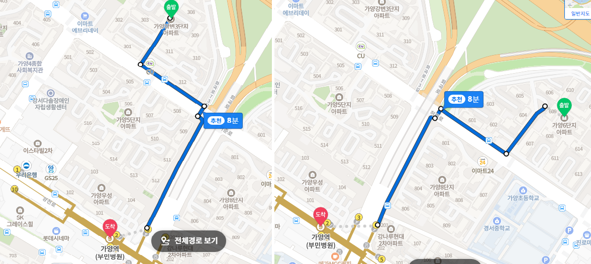 가양역까지는 두 단지 모두 도보로 8분 정도 나온다.