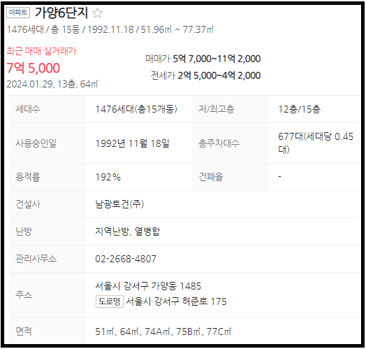 가양강변3단지는 1992년에 지어진 32년 차 아파트다. 총 1,556세대고 주차는 세대당 0.39대로 적은 편이다.