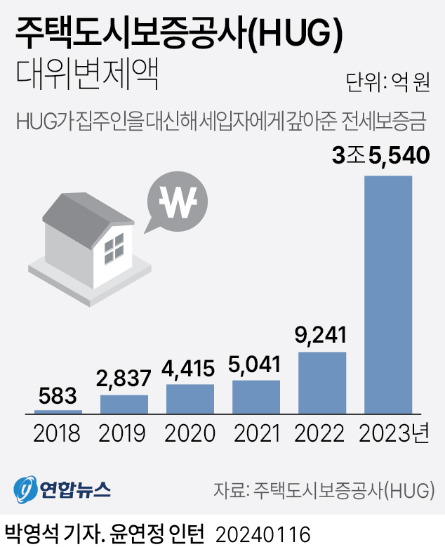 지금 주택도시보증공사 (HUG)가 집주인을 대신해 대위변제한 금액이 작년 한 해에만 3.5조 원을 넘었다.