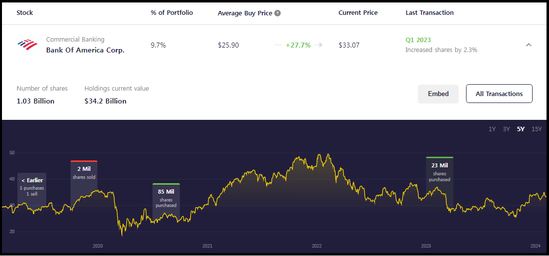 미국의 대표 은행 중 하나인 뱅크오브아메리카가 포트폴리오 상 2위의 종목이다.