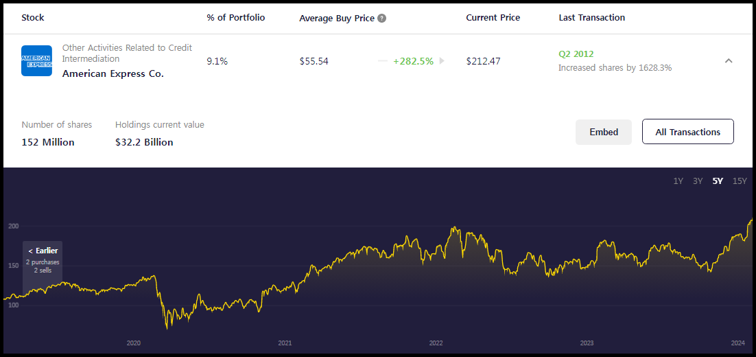 미국의 신용카드 결제 회사인 아메리칸익스프레스가 포트폴리오 비중 3위를 차지했다.