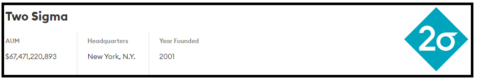 2001년에 설립된 투 시그마는 인공지능과 머신러닝, 분산 컴퓨팅과 같은 기술을 활용하여 본인들의 투자에 활용하고 있다. 상당히 기술 발전을 적극적으로 활용하는 회사라고 볼 수 있다.