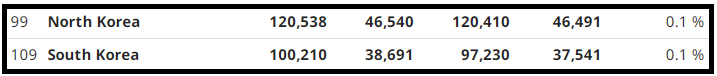 북한은 120,538㎢로 대한민국보다는 크기가 조금 더 크다.