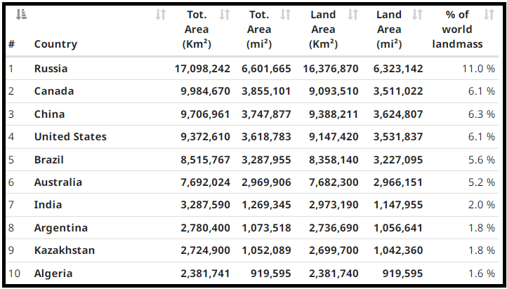 그래서 전 세계 영토의 Top 10 순위를 알아보도록 하자. 영토의 크기는 육지 + 수공간 (강, 호수, 저수지 등)을 포함한다.