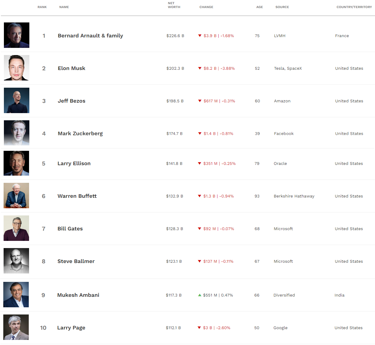 포브스가 데이터를 가지고 있는 인물들이 소유한 자산 기준으로 평가 되었으며, 상장 주식의 경우 주가에 따른 가격변동이 자산에 반영되어 순위가 나타난다.
