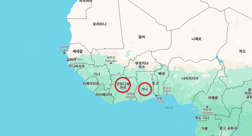 전세계 코코아 공급의 60%가 코트디부아르와 가나 이 두 나라에서 나온다.
