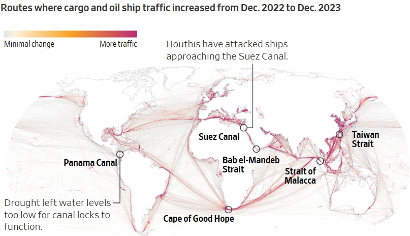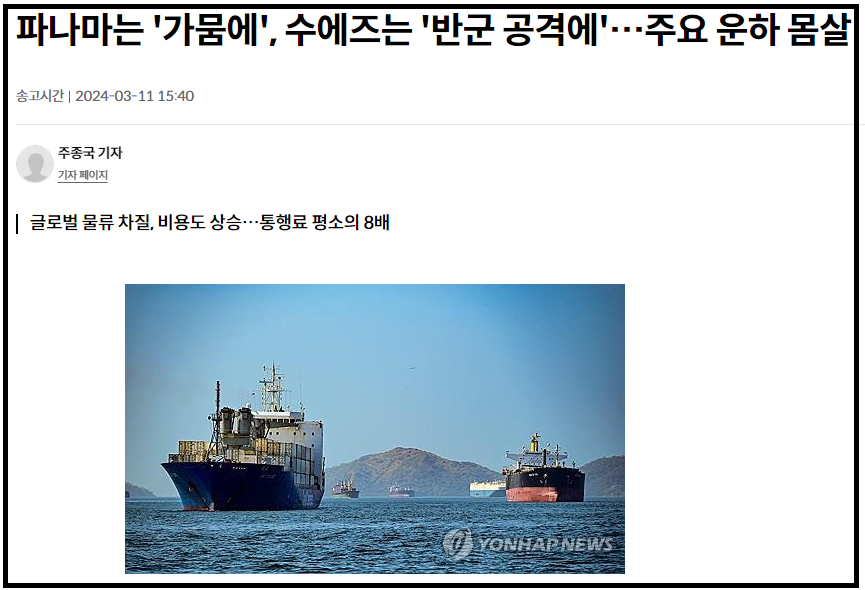 최근은 예맨 후티반군이 선박들의 활동을 방해하면서 수에즈 운하로 가는 물동량이 줄어들고 있는 상황이다.