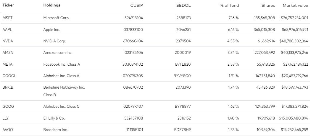 VOO에 담겨 있는 종목 상위 10개를 보면, 기술주 위주로 되어있다.