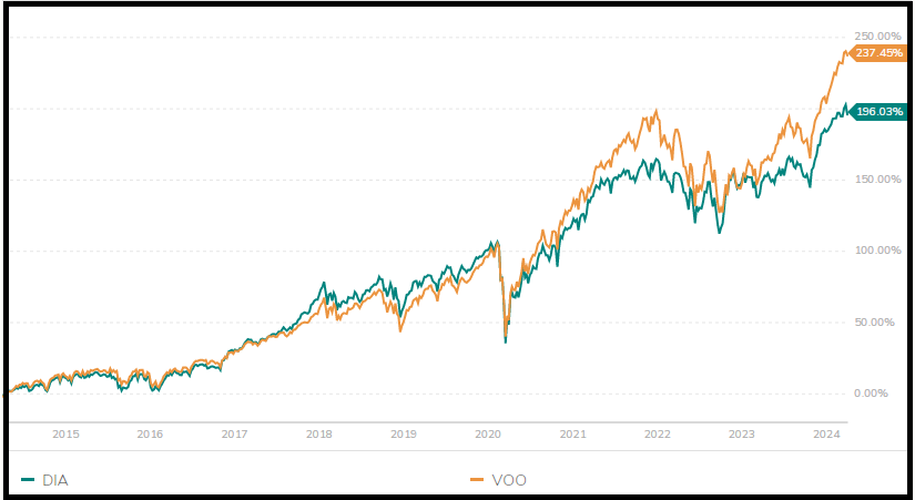 10년간 주가 성장률을 비교해보면 VOO와 DIA는 비슷한 흐름으로 가는 모습을 볼 수 있다.