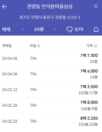인덕원마을삼성의 경우 세대수는 1300세대로 더 크고, 대신 1998년식으로 27년 차 구축인데 최근 거래가 7억 원 중후반대다.