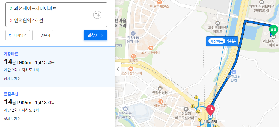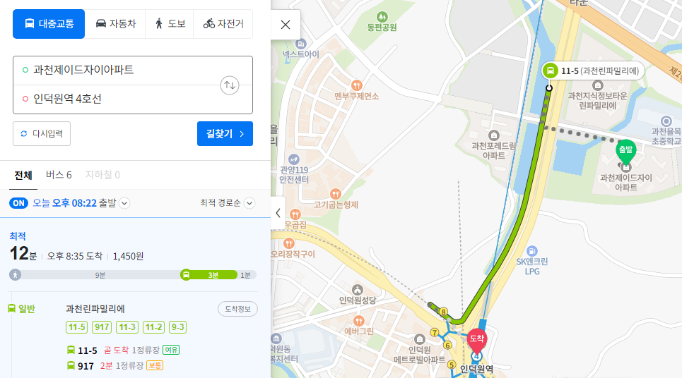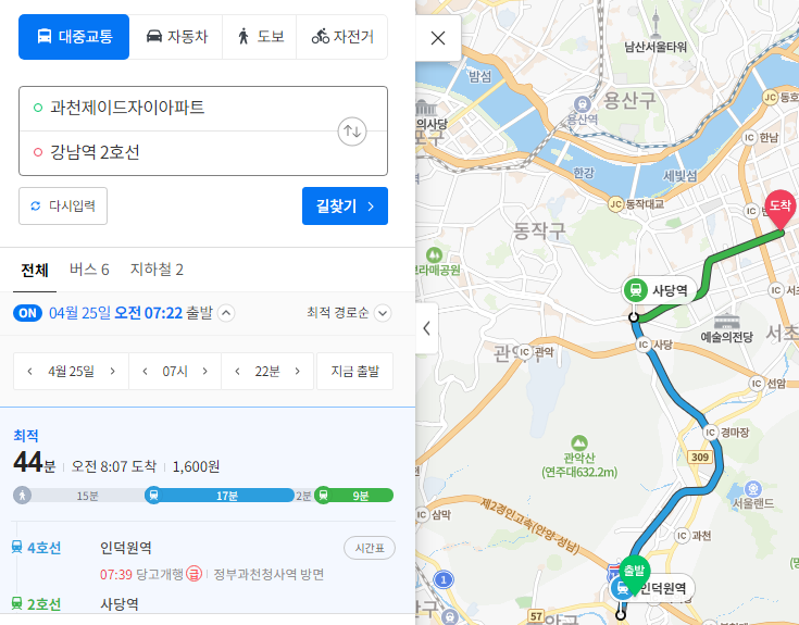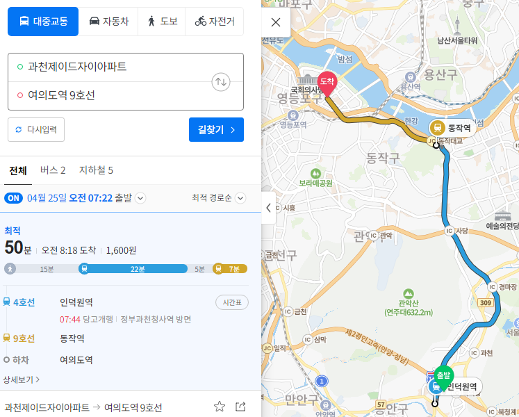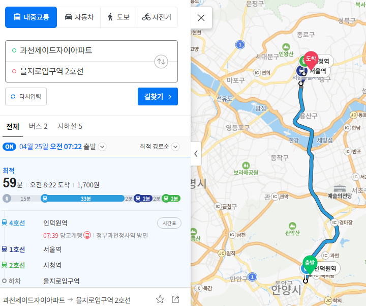 환승 한번 하는 루트는 5분정도 추가된다고 보면 된다.