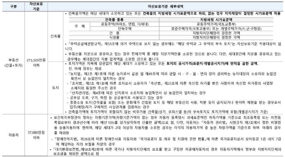 자산기준과 소득기준은 아래를 참조하면 된다.