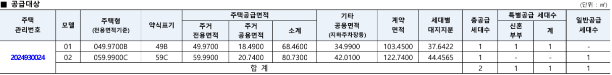 49 타입은 신혼부부 특별공급에 해당하는 세대고, 59 타입은 일반공급에 해당하는 세대다.