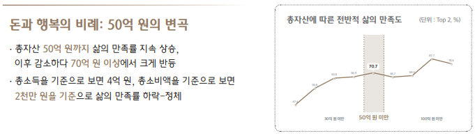 총자산은 50억 원까지는 삶의 만족도가 우상향 하다가 50억원 ~ 70억 원 구간에서 만족도가 감소한다.