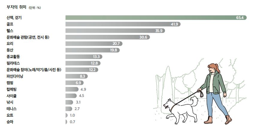 부자는 취미생활로 산책, 걷기를 가장 많이 꼽았다.