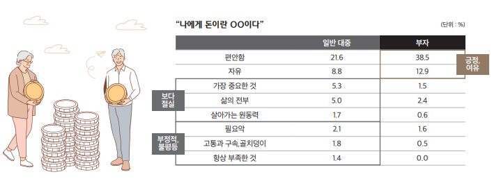 일반 대중들은 부자에 비해서 돈에 대한 인식이 보다 절실하거나 부정적인 비율이 높았다.