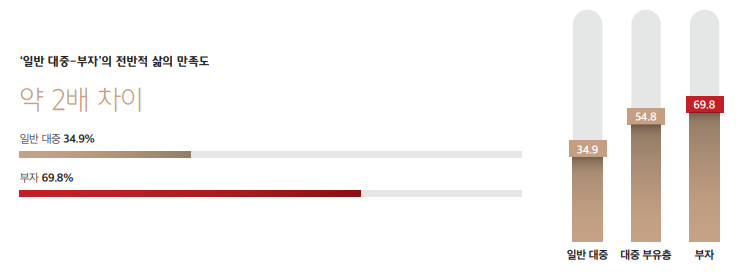 또한 일반 대중과 부자의 삶의 만족도 차이는 약 2배 정도로 나타났다. 경제력이 좋을수록 삶의 만족도도 높아진다고 볼 수 있다.