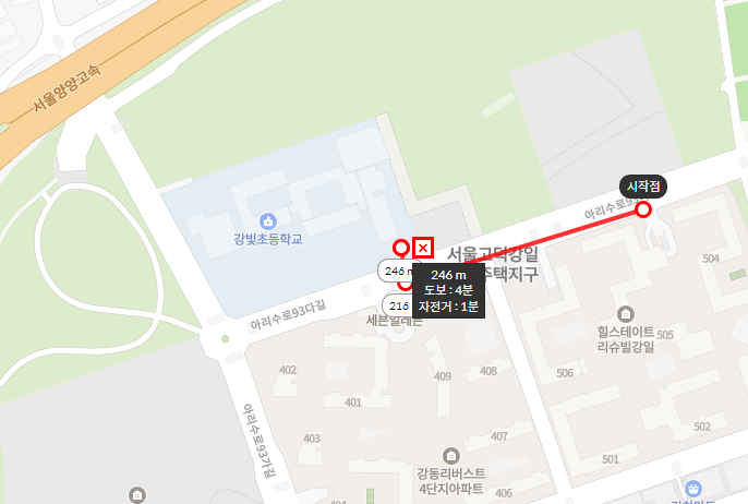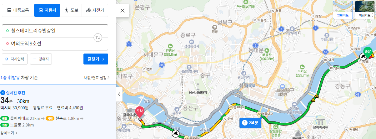 올림픽대로 바로 앞이니 자차로는 빠를까 싶어서 확인해 봤는데 확실히 더 빠르기는 하다.