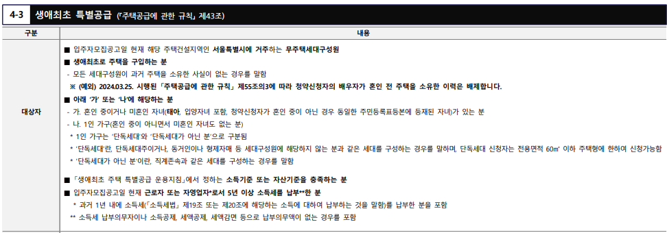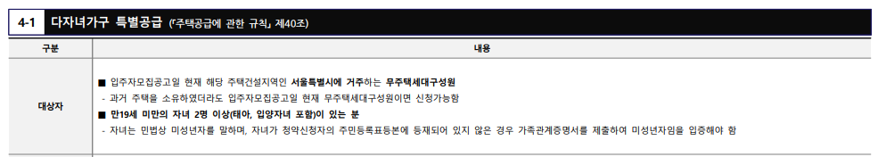 특별공급은 다자녀는 자녀 2명 이상인 기준만 있으면 되고, 나머지 신혼부부와 생애최초는 자산과 소득기준이 있다.