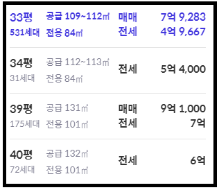 20평대가 없고 30평대 이상으로만 구성되어 있어서 1~2인 가구보다는 기본적으로 3~4인 가정을 고려한 아파트 단지라고 보면 되겠다.