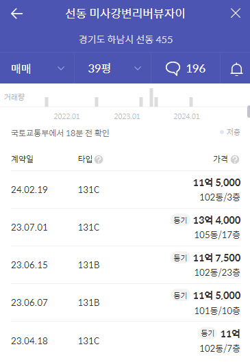 바로 동쪽에 있는 555세대 미사강변리버뷰자이의 가격을 보자.