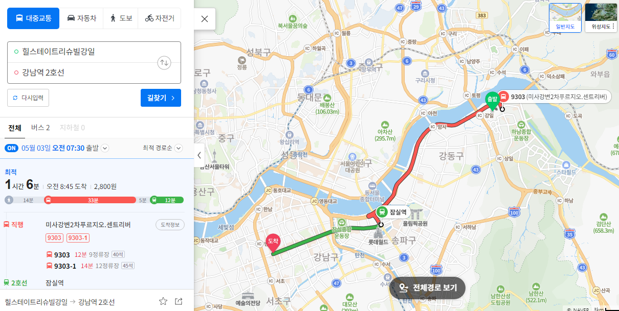 지하철까지 거리가 멀면 버스로 가면 되지 않냐고 물을 수 있는데 실제로 강남까지 가장 최적은 버스 루트로 나온다.