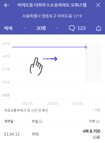 근처에 있는 다른 오피스텔이 전용 40 기준 2021년에 4.9억 원 정도다.