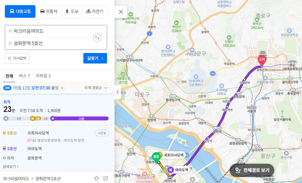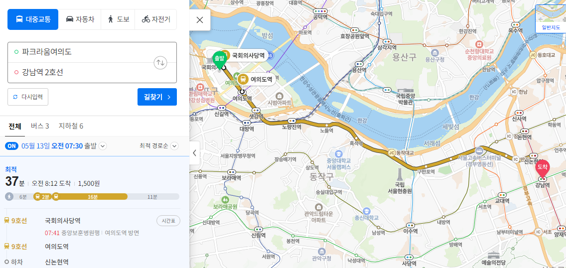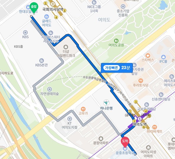 동여의도에 있는 윤중초등학교로 가야 하는데 도보로 23분가량 걸린다.
