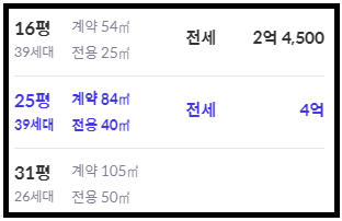 16평, 25평, 31평 세 가지인데 위에서 말했듯이 저 평형이 아파트 평형과 비슷하다고 생각하면 오산이다.