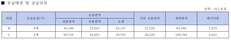 계약면적 기준으로는 B타입은 84제곱미터, C타입은 105 타입 두 가지인데 전용면적 기준으로는 B타입이 40제곱미터 (일반 아파트 기준으로 약 20평형), C타입은 (일반 아파트 기준으로 약 30평형)과 유사하다.
