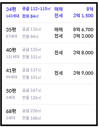 34평형 (전용 84제곱미터)이 가장 작은 평수다.