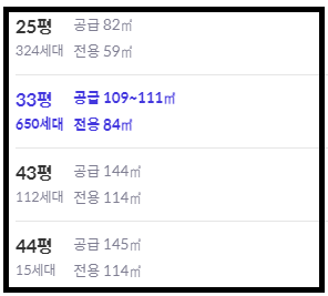 25평 (전용 59제곱미터), 33평 (전용 84제곱미터) 두 타입이 가장 많다.