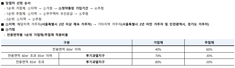 59제곱미터의 경우에는 가점제 40% / 추첨제가 60%다. 그 외의 모든 평형은 가점제가 70% / 추첨제가 30%다.