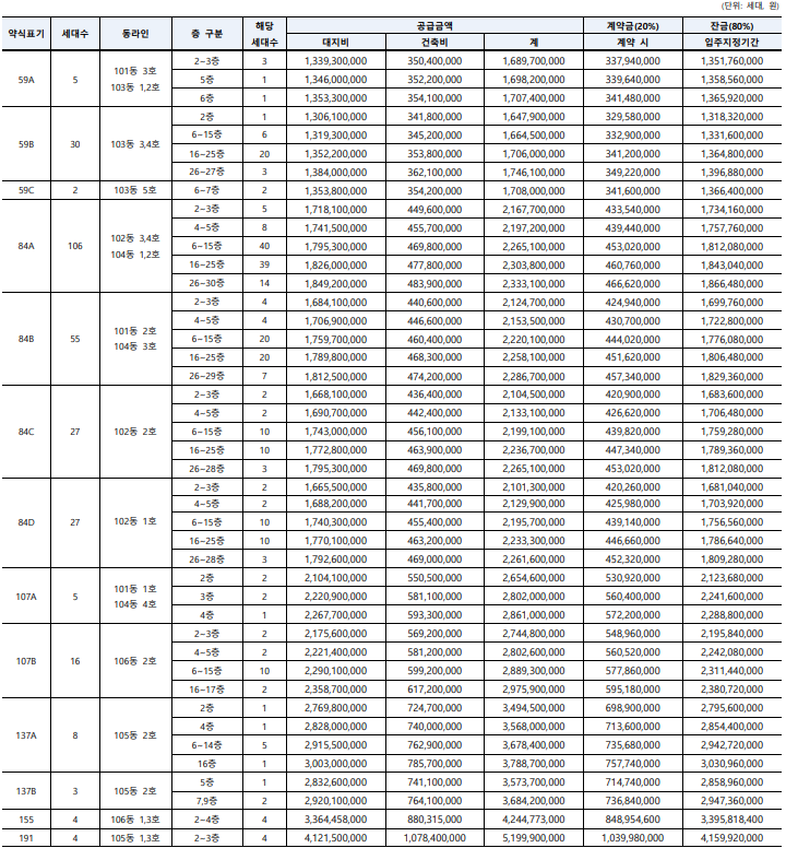 84A타입, 84B타입, 59A/84C/84D타입 순으로 나오는 세대수가 많다.