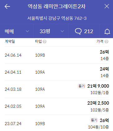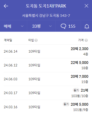 바로 옆에 있는 도곡 1차 아이파크의 가격을 보자.