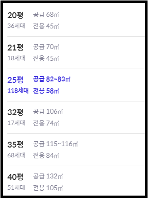 여러 가지 평형이 있지만 전용 58제곱미터 (25평형)과 전용 84제곱미터 (35평형) 두 가지를 위주로 보자.