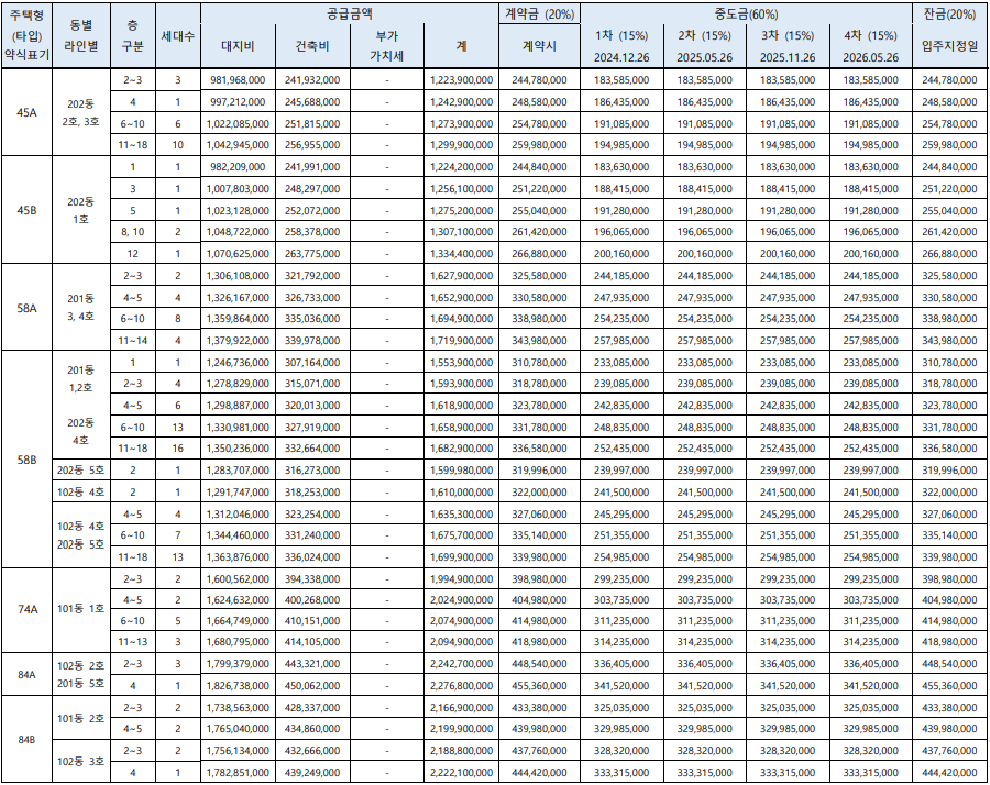 59제곱미터 기준으로는 21억 원, 전용 84제곱미터 기준으로는 26억 원이다.