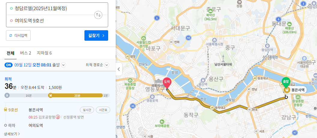 봉은사역에서 9호선 급행으로 가면 되기에 생각보다 시간이 오래 소요되지 않고 환승이 없다.