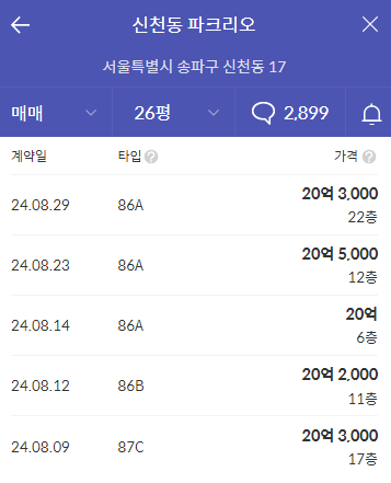 바로 인근의 17년 차 6,800세대의 파크리오의 최근 실거래가를 확인해 보자.